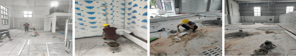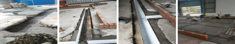 2021-6-8成都莱燚和食品有限公司三期厂房装修施工现场:排水沟贴砖,建渣清扫,挂钢绳