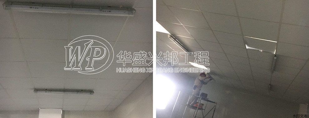华盛兴邦厂房装修工程案例现场,成都市柏味香食品有限公司厂房装修现场,现场灯具安装,吊顶。建食品厂找华盛兴邦。