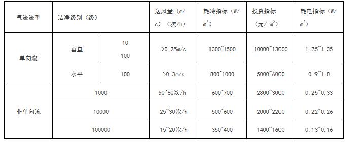不同洁净级别洁净厂房的送风量、冷量投资耗电的指标