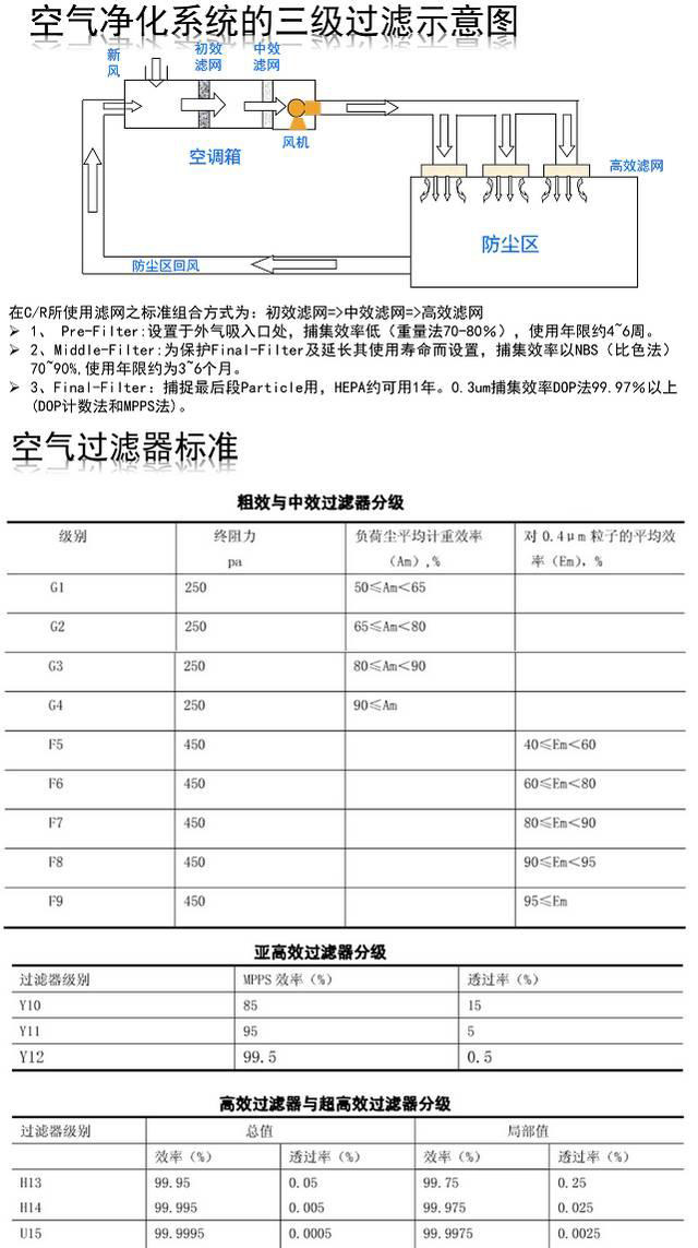 空气过滤器是空气洁净系统中最主要的设备。过滤器有三大类:初效过滤器﹑中效过滤器﹑高效过滤器(或亚高效过滤器)。
