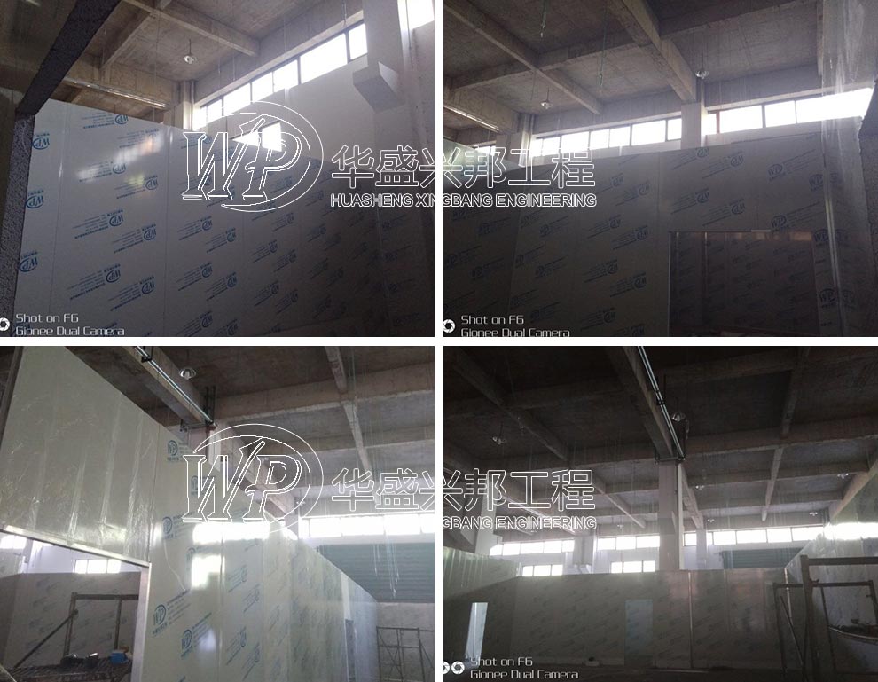 华盛兴邦厂房项目施工现场——四川憨憨豆匠食品有限公司二期厂房装修现场,现场墙板完成,开始吊顶。