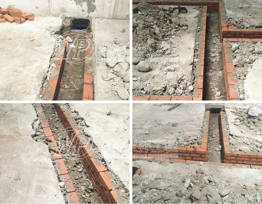华盛兴邦厂房项目施工现场,成都妙仕康食品有限公司厂房装修现场,排水沟施工中