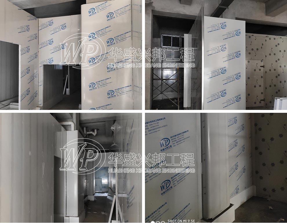 华盛兴邦厂房装修现场,四川王臻王牛肉有限公司厂房装修施工现场,现场立墙板,打地槽