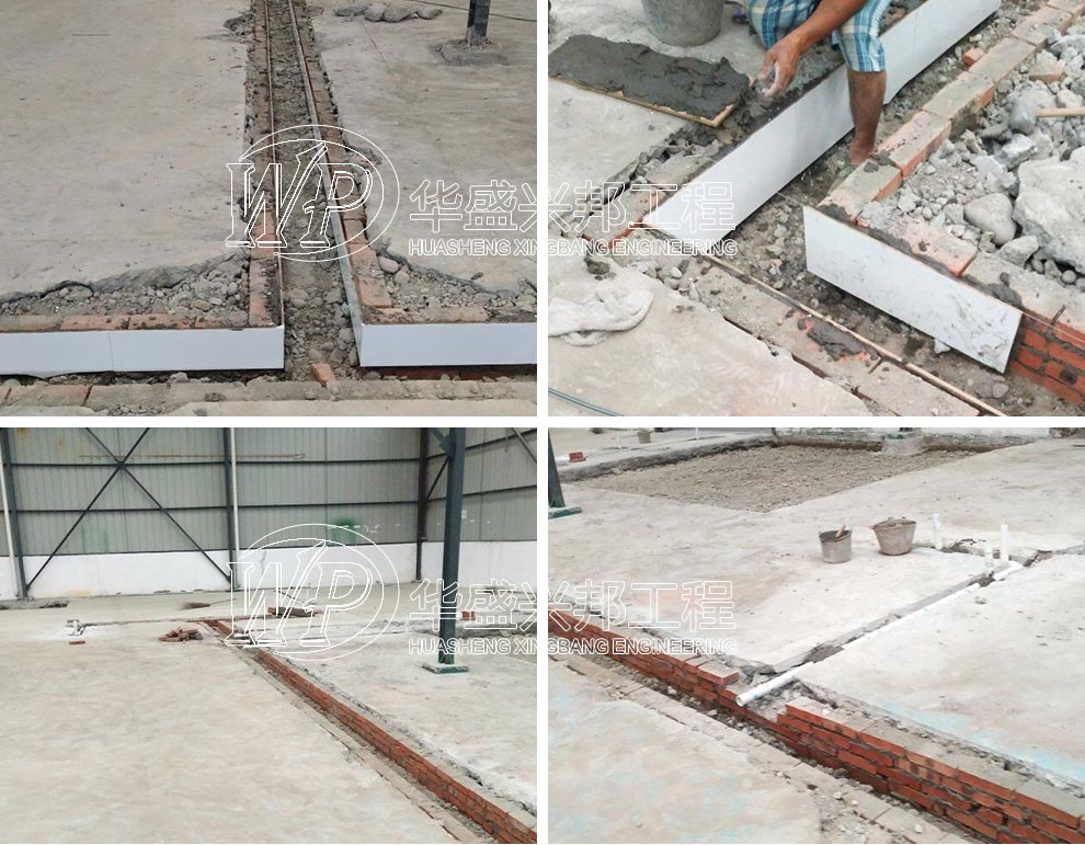 华盛兴邦厂房装修现场,成都妙仕康食品有限公司厂房装修现场,排水沟施工中