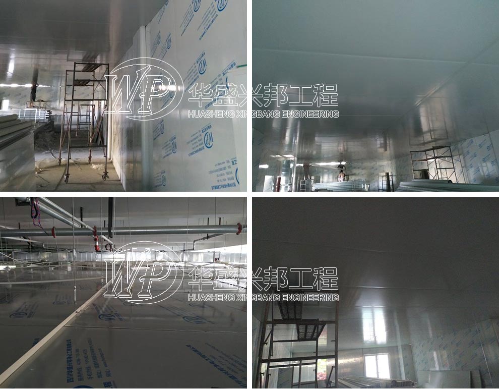 华盛兴邦厂房装修现场,青岛盛客隆食品有限公司厂房装修现场,顶板吊顶施工中