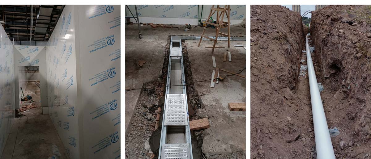2021-4-11 蒙阳惠昌食品厂房装修现场:1:排污管完成80%、室内排水管完成100%; 2:卸货通道挖掘完成100% ;3:彩钢墙板完成60% ;4:排水沟卡条固定完成30%。