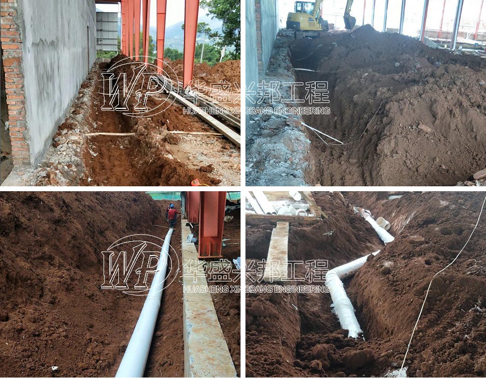 华盛兴邦厂房施工现场,瑞丽市盛达食品有限公司厂房装修施工现场,排水沟挖完,地下排水管道施工中