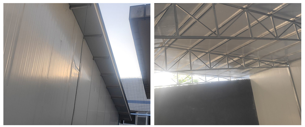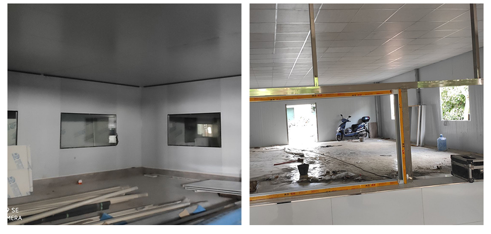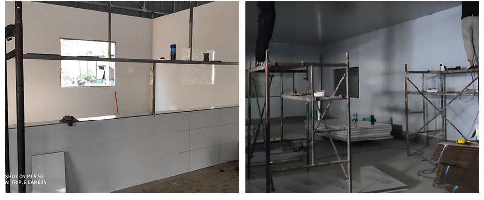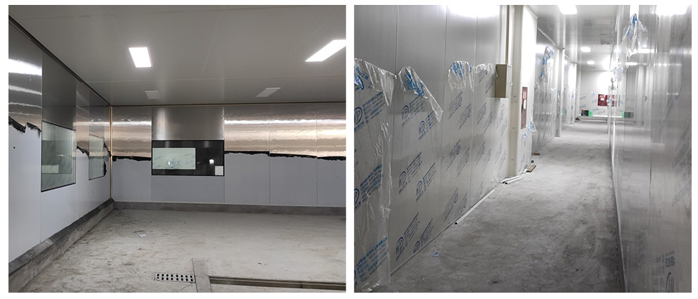 2020-6-30四川春之源食品有限公司厂房装修现场,空调安装人员进场,墙板立板完成,顶板计划施工