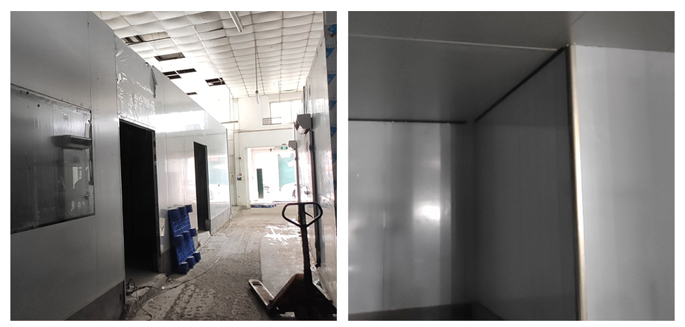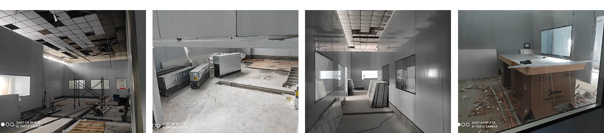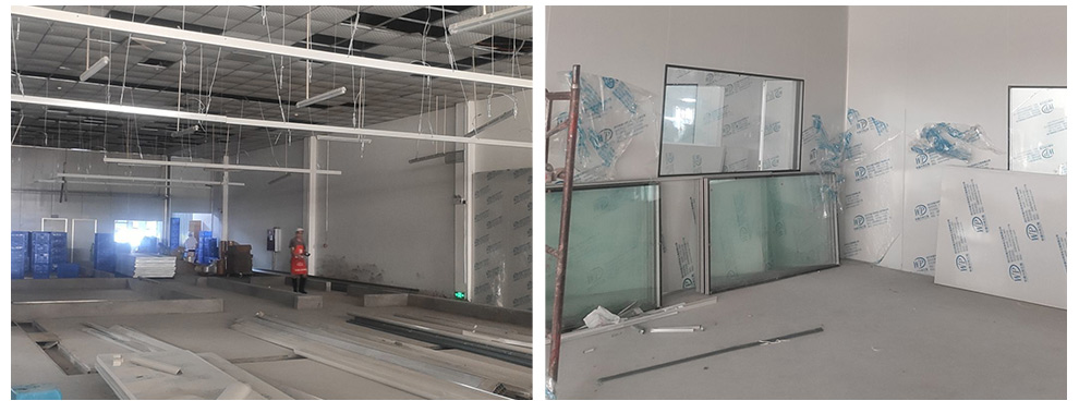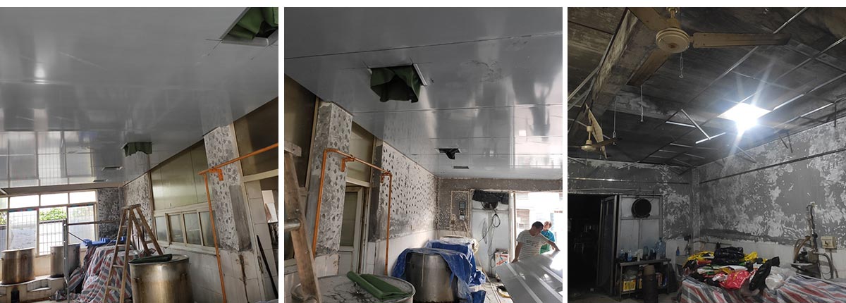 2020-08-19四川春之源食品有限公司厂房装修现场,油房改造开始,顶板安装完成一间,风管进场安装