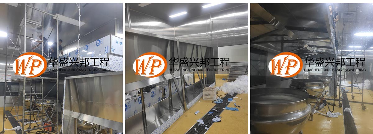 2020-08-13四川春之源食品有限公司厂房装修现场,1.烟罩安装完成50% 2.风机风柜吊装完成 3.地坪修补完成