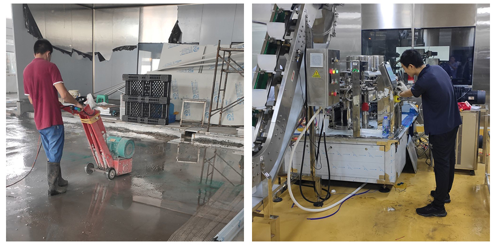 2020-7-26四川春之源食品有限公司厂房装修现场,聚氨酯地坪完成,水电安装收尾工作