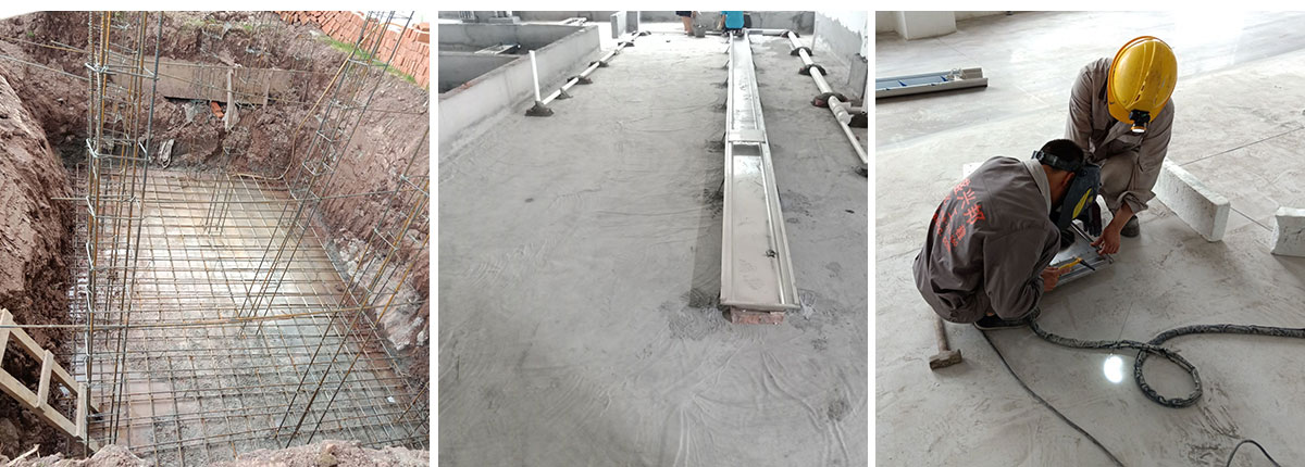 2020-7-10四川兵哥哥食品有限公司厂房装修现场,车间不锈钢排水沟焊接,排水沟安装,户外污水池钢筋施工