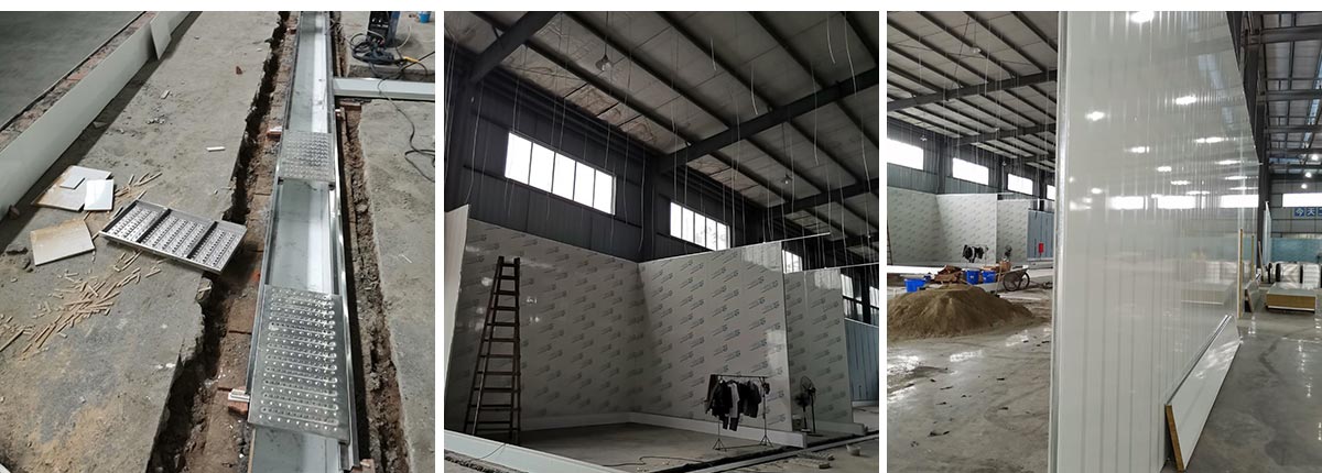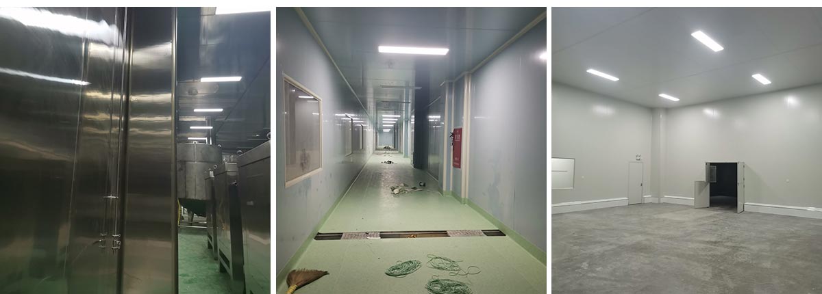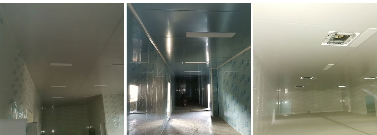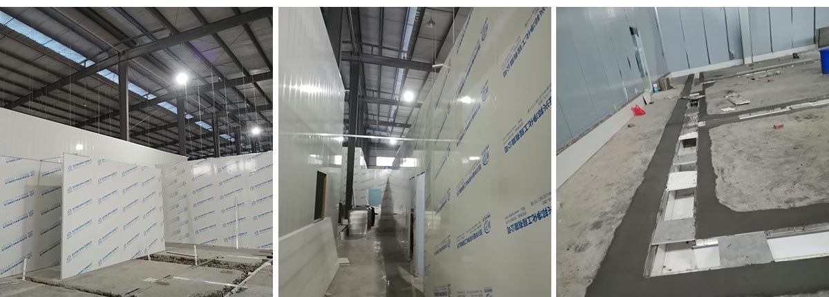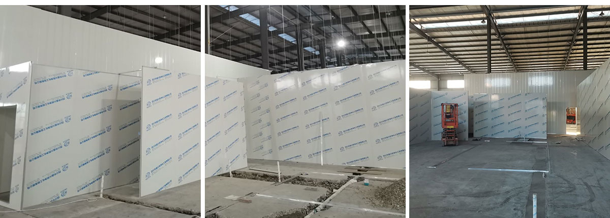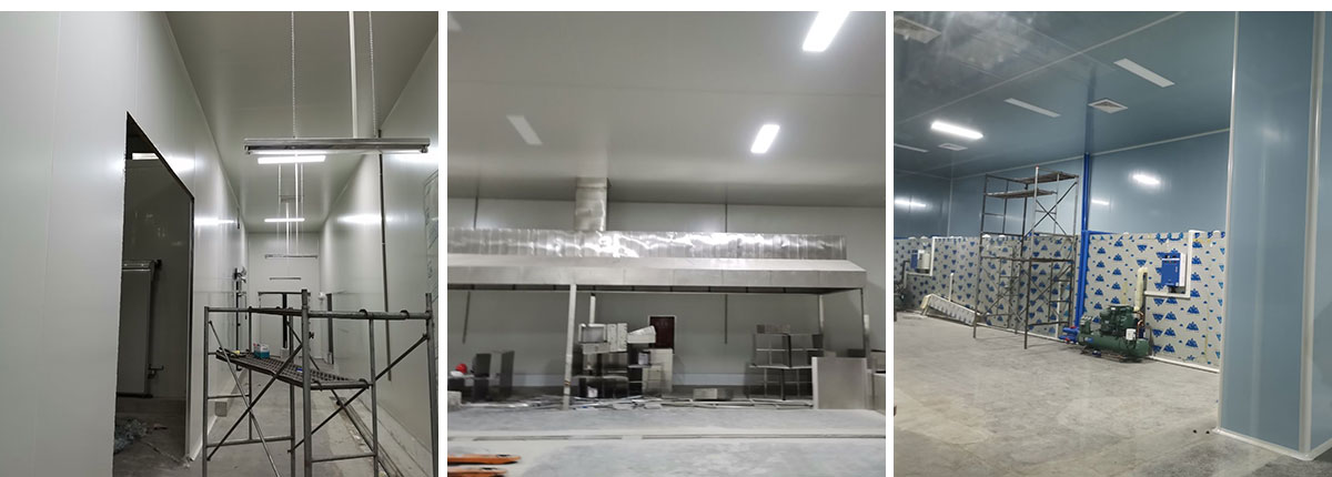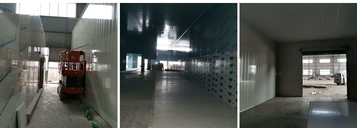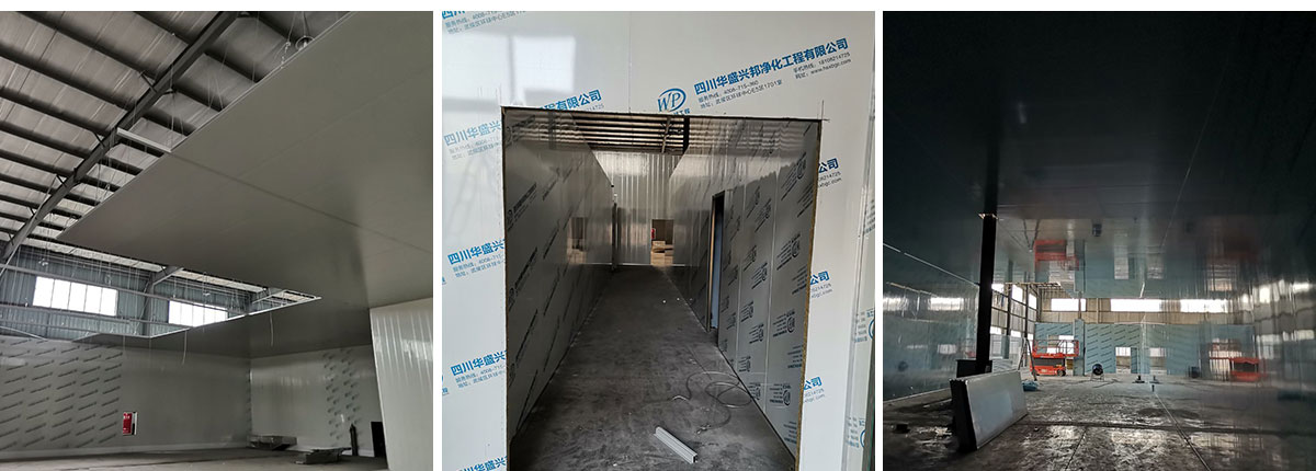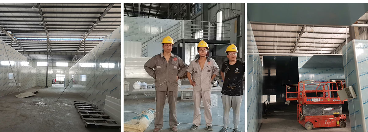 2020-9-23四川怡味农业科技发展有限公司厂房装修现场,吊筋安装完成,顶板安装完成;彩钢墙板安装完成,门洞开设完成,自制门框安装;墙板撕膜打胶完成;场地清理。