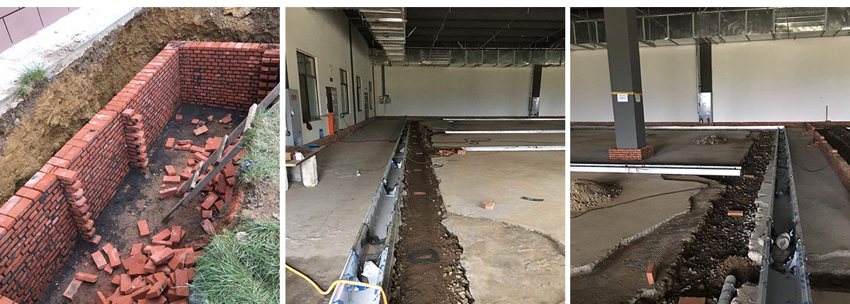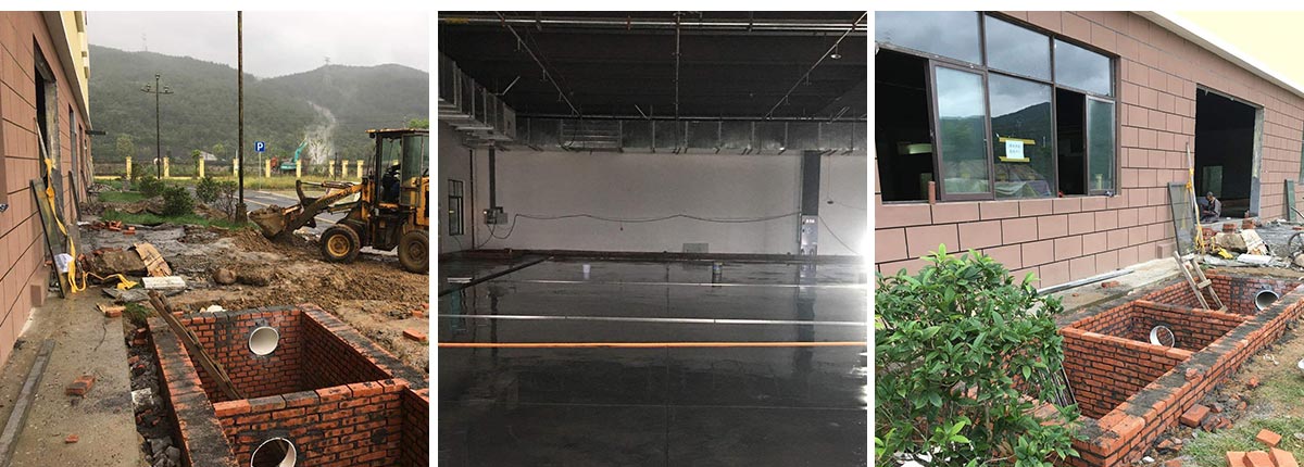 2020-9-15成都智琪食品有限公司二期厂房施工现场:车间明沟找平打点,隔油池砌筑施工