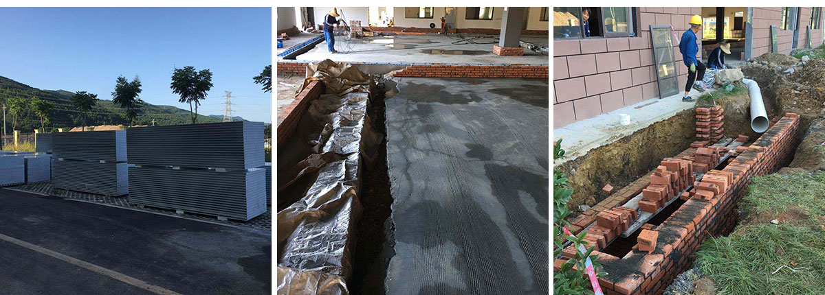 2020-9-17成都智琪食品有限公司二期厂房施工现场:排水明沟,排污管施工,板材卸货