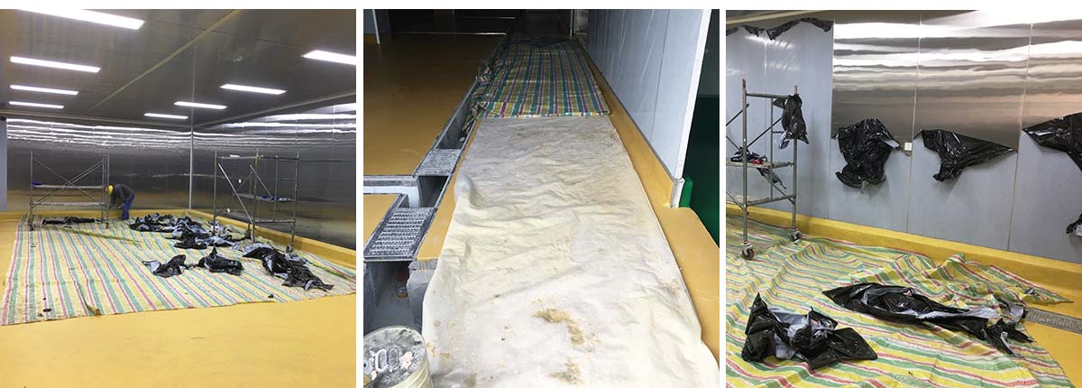 2020-11-01成都智琪食品有限公司二期厂房施工现场:1、隔油池盖板保养第九天;2、聚氨酯地坪施工基层吸尘灰第一遍已完成;3、聚氨酯超耐磨地面底涂完成,刮砂完成50%;4、彩板除必要的预留空间外已封顶,下阶段将转移作业区域进入门窗制作,通道施工环节。5、智琪风管已拆除90%.不锈钢折件正在加紧制作,蒸煮车间裙边折件同步制作中。