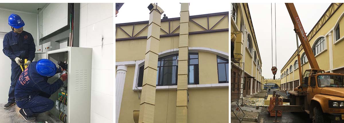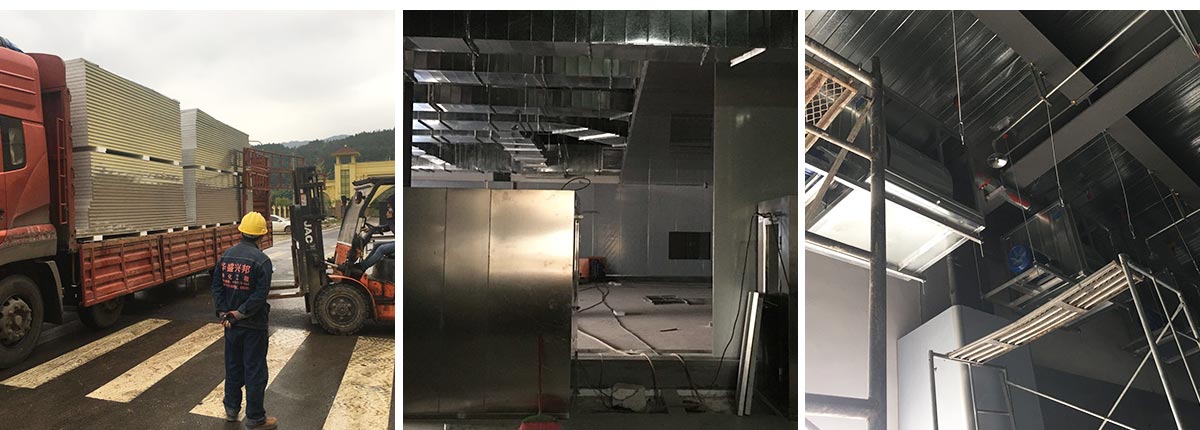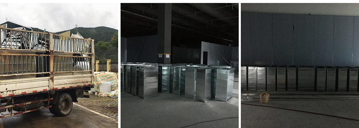 2020-10-13成都智琪食品有限公司二期厂房施工现场:风管材料到场卸货,风管组装