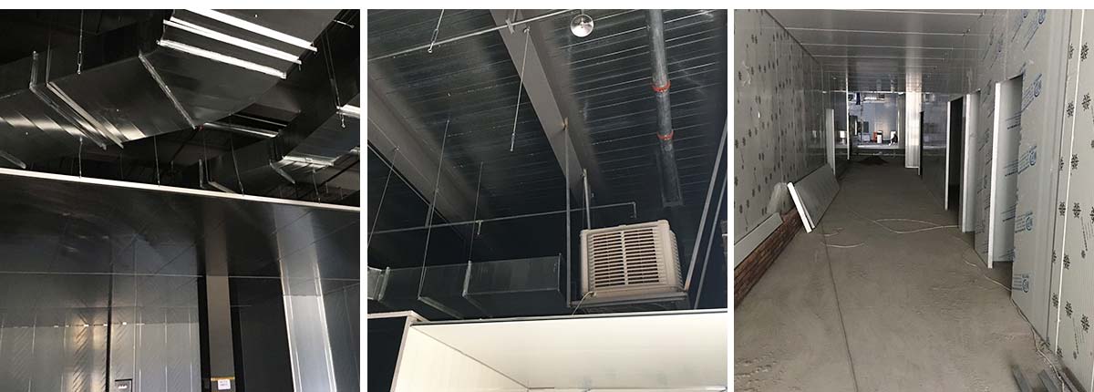 2020-10-14成都智琪食品有限公司二期厂房施工现场:1、风管合缝咬口完成100%;2、冻库地坪养护第三天;3、彩板加固角铝施工完成10%;4、外包间区域更衣室墙板施工完毕。