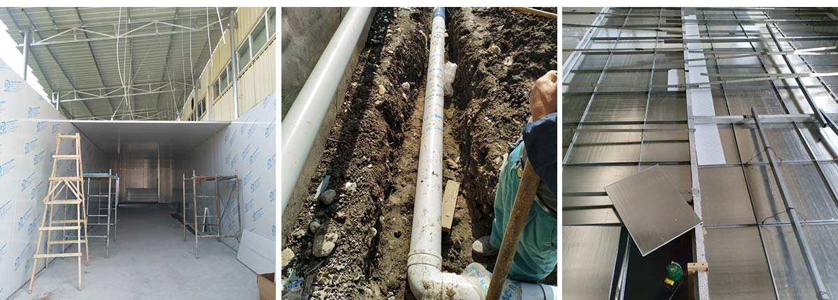 2020-10-18四川大蕴发食品有限公司厂房装修现场,墙板安装完成99%,卷帘门门套安装完成,室内排水管安装完成,室外排水管安装完成90%,灯具插座配管穿线完成45%。