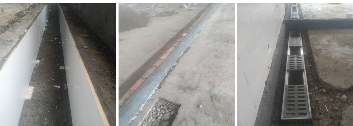 2020-9-15四川大蕴发食品有限公司厂房装修现场,排水沟立面贴砖完成,挡水墙贴砖施工
