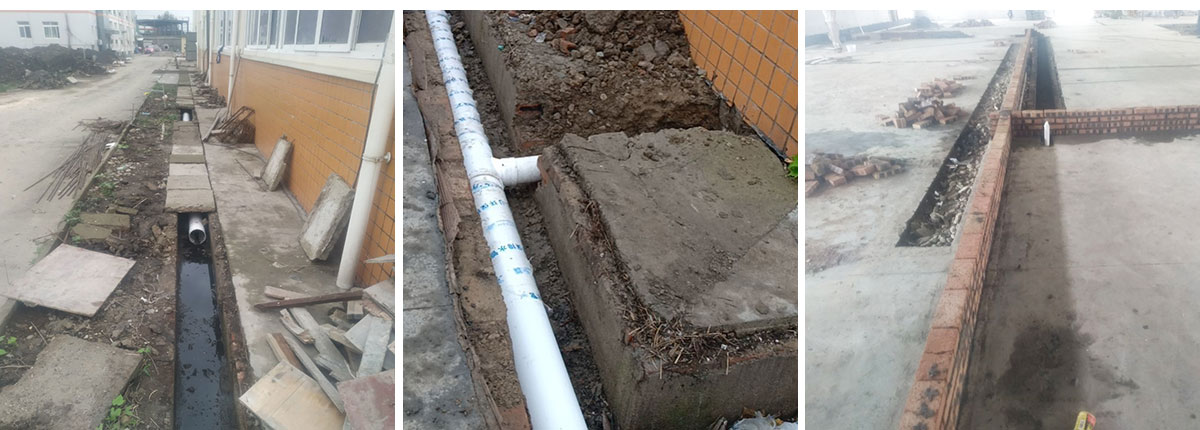 2020-9-13四川大蕴发食品有限公司厂房装修现场,室外排水沟施工,室内排水施工