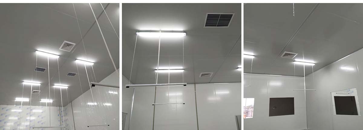 2020-10-3四川大蕴发食品有限公司厂房装修现场,吊顶完成10% 挂T铝加钢绳打角铝等吊顶准备工作,顶板完成35% 圆弧完成5% 地槽完成95% 胶条完成15%