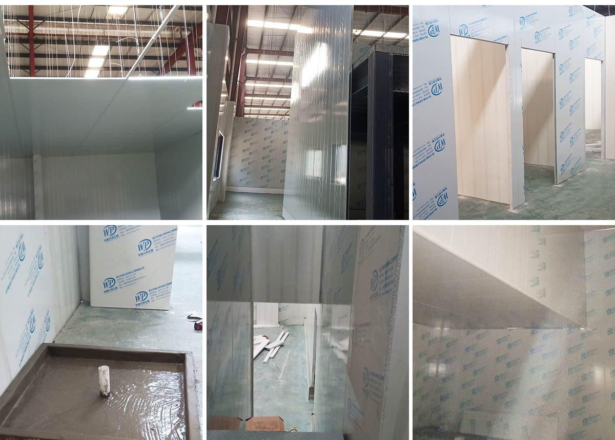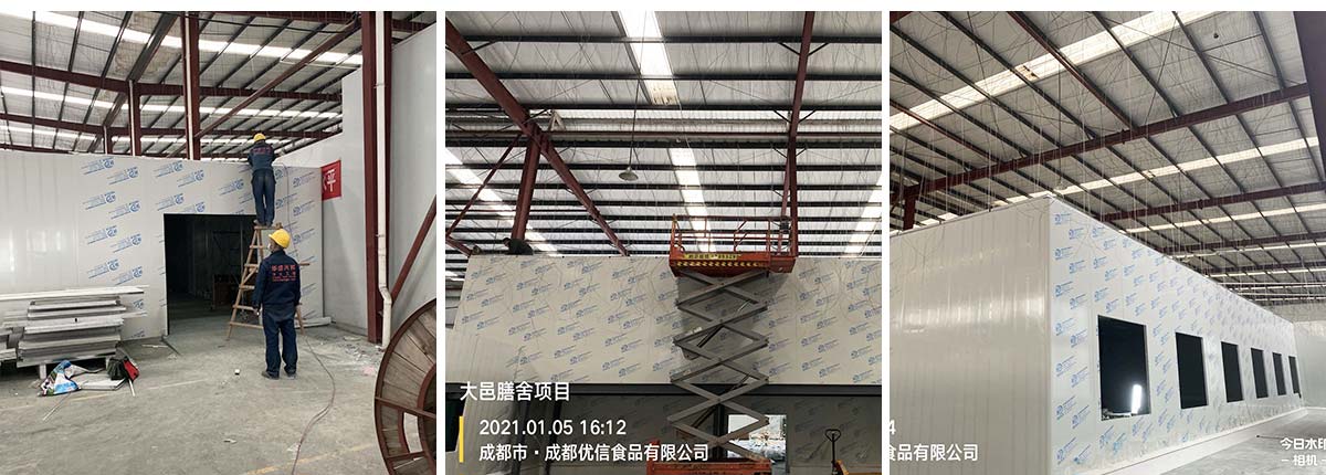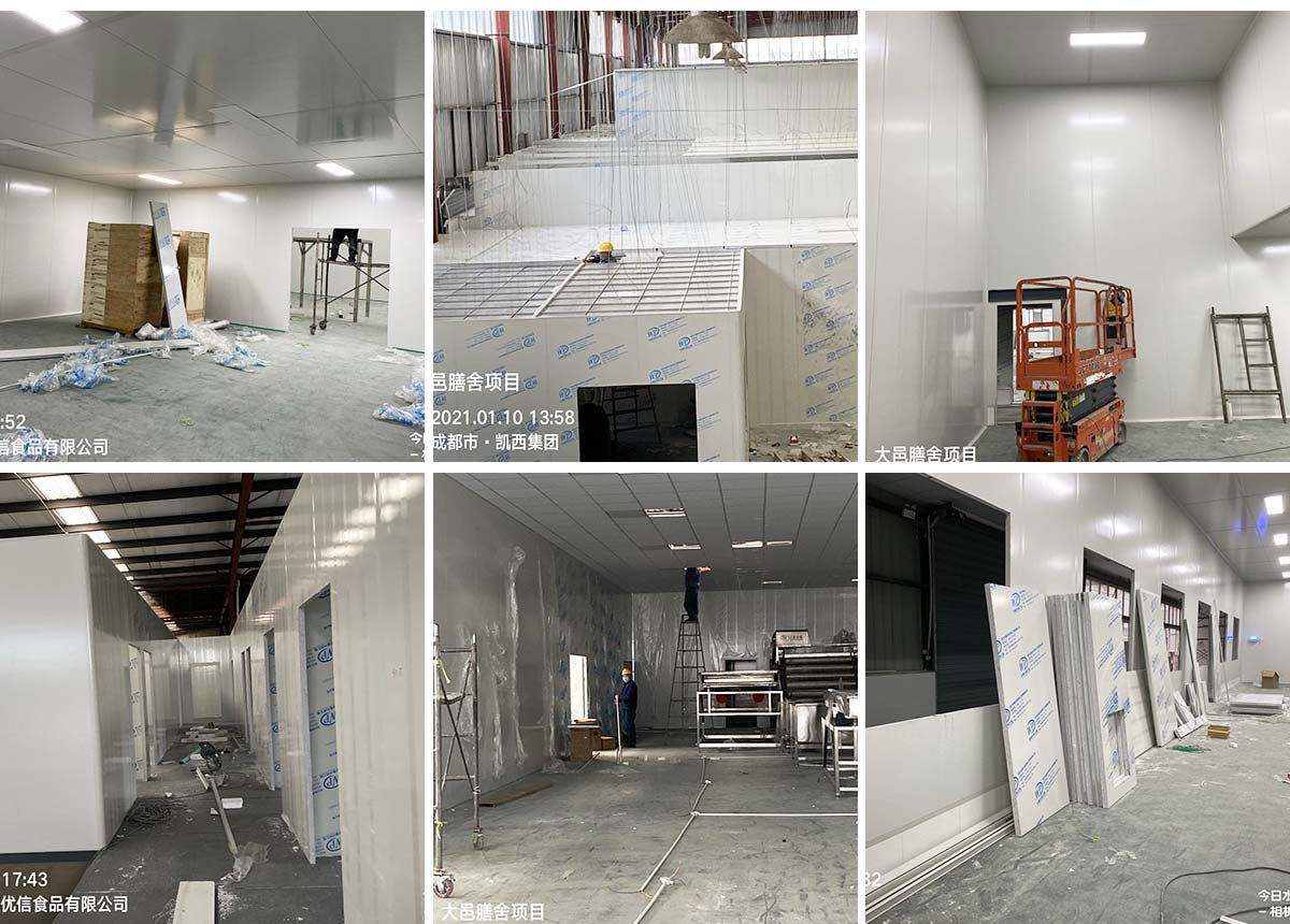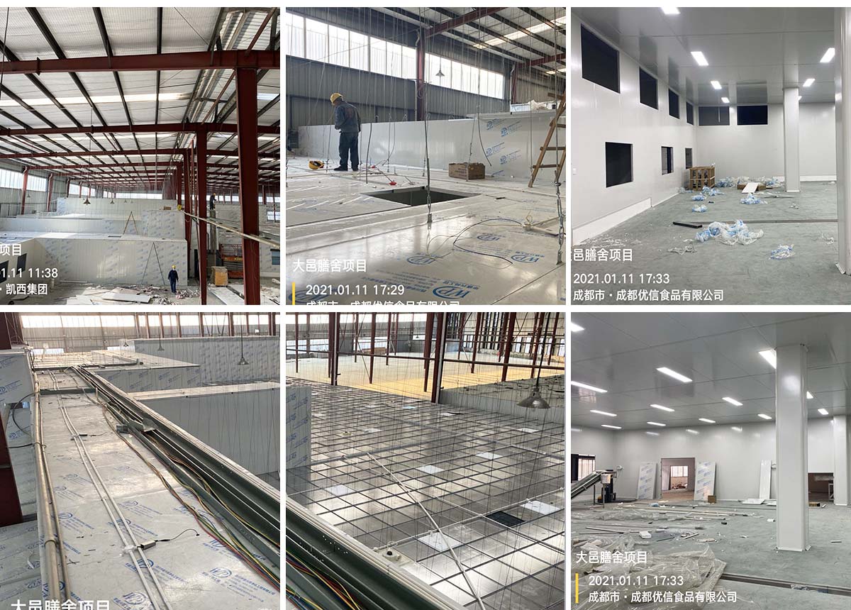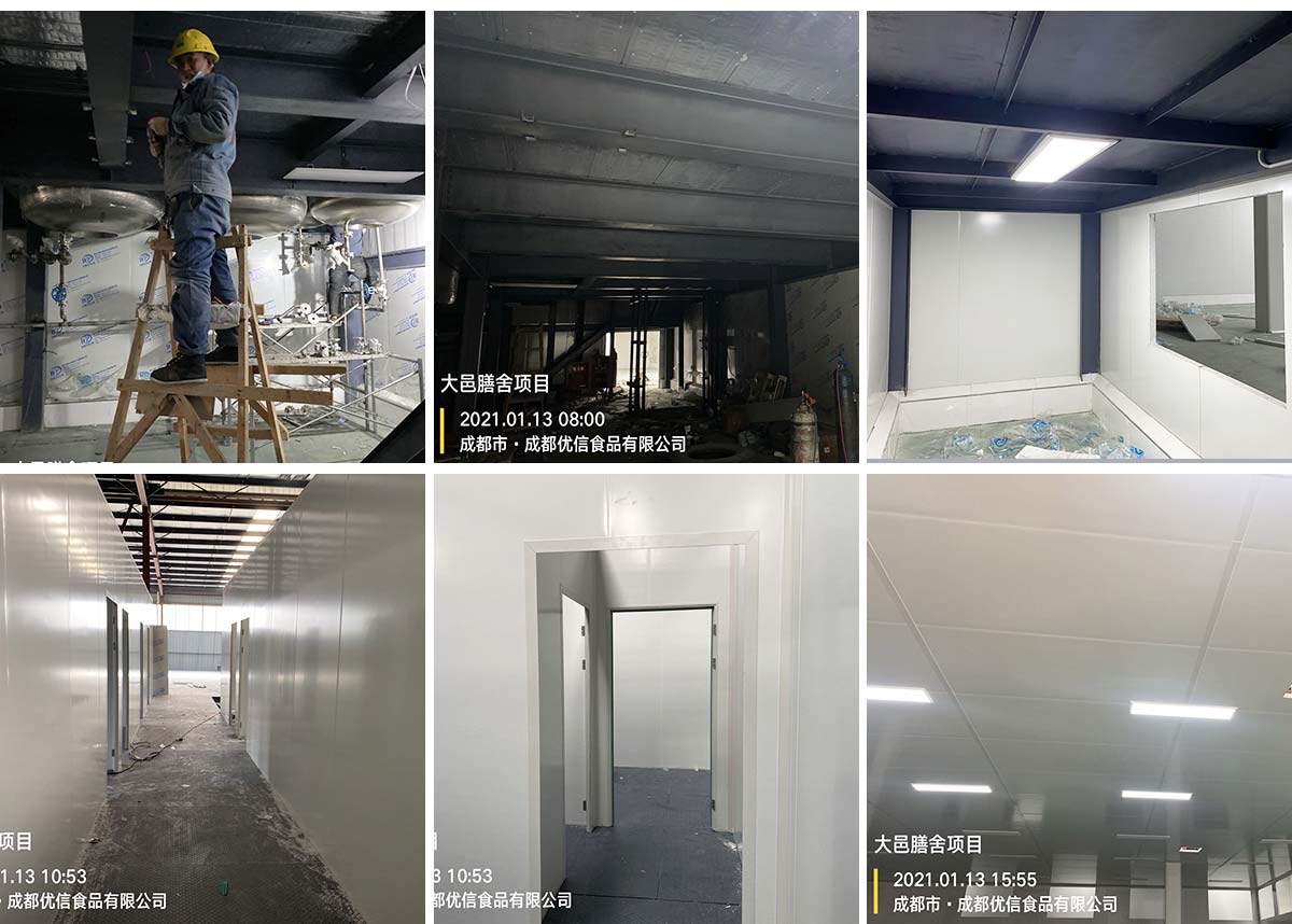 2021-01-11 成都膳舍食品有限公司厂房施工现场:吊顶施工,电路施工,墙板撕膜