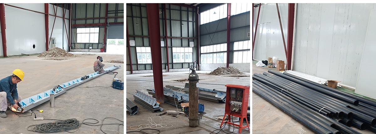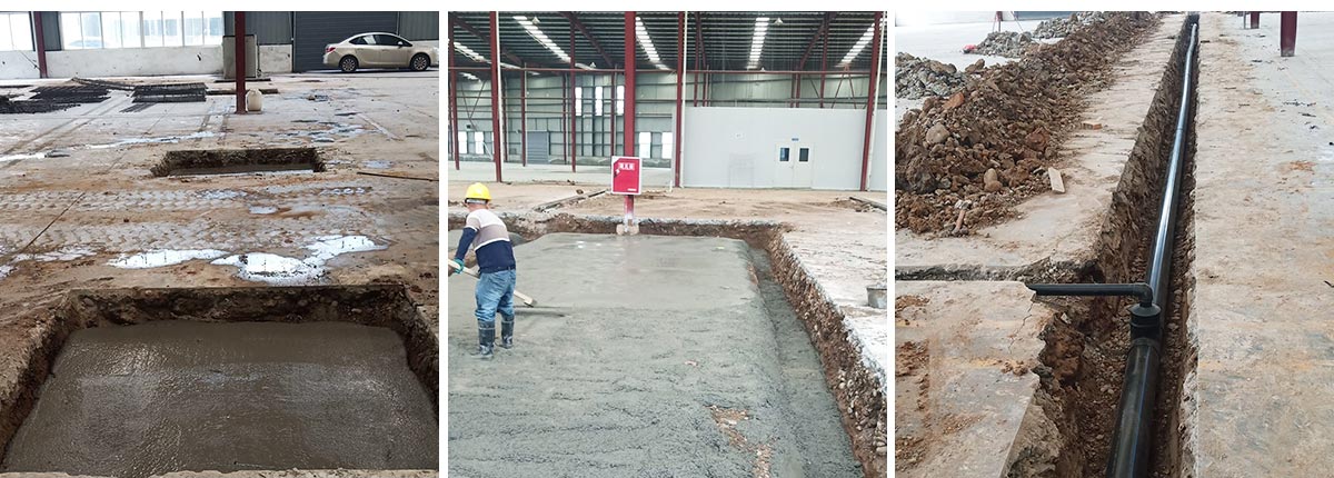 2020-10-2 成都膳舍食品有限公司厂房施工现场:不锈钢排水沟施工,排水管道到场