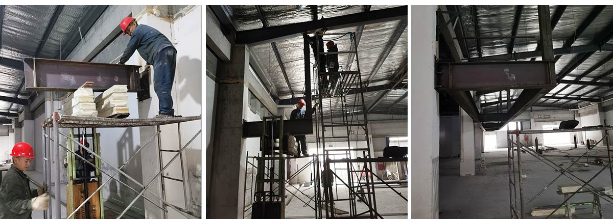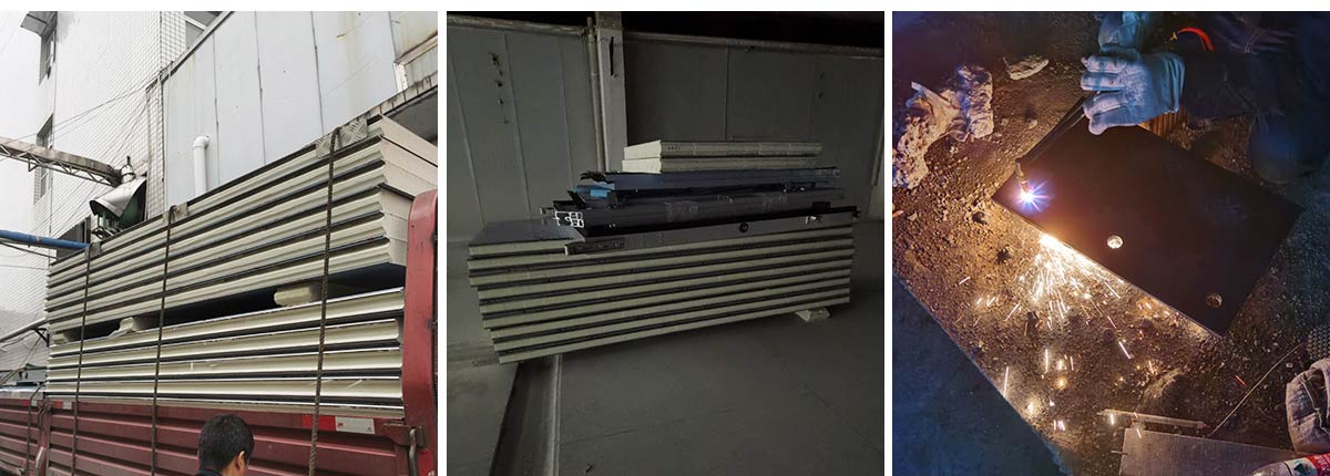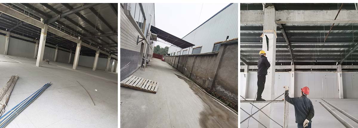 2020-12-03 四川九升食品有限公司厂房装修现场:1、化学螺栓钢板预埋,2、冻库材料进场