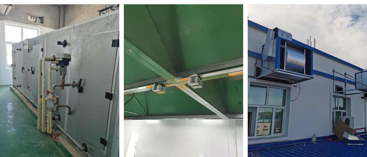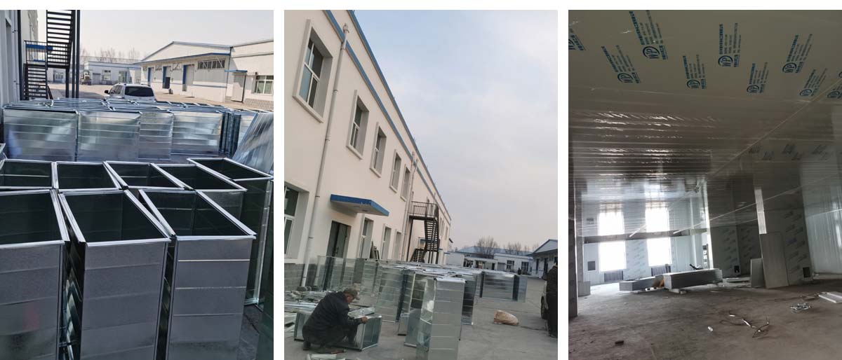 2021-5-19 内蒙古科沁万佳食品有限公司厂房施工现场: 1: 空调机组安装完成90% 2:烟罩 风管 制作及安装完成55%