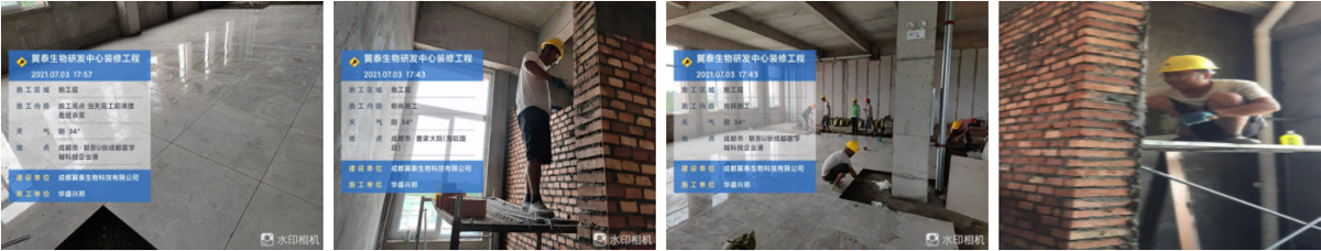 2121-7-4成都翼泰生物科技有限公司厂房施工现场:1.地砖施工人员,完成面积约30平; 2.砌体抹灰施工,卫生间包排水管 抹灰完成1/3