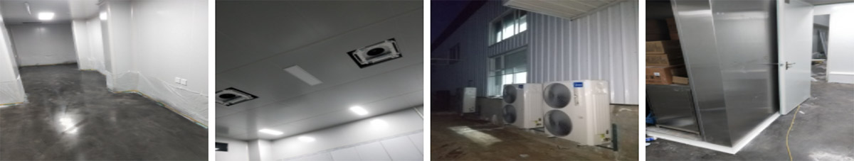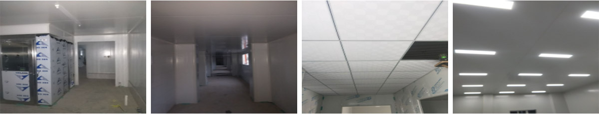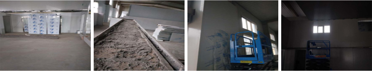 2021-10-4陕西闫府食品有限公司厂房装修现场:1:彩钢墙板完成60%; 2:彩钢顶板完成35%; 3:挂丝杆完成35%; 4:撕膜打胶完成38%; 5:自制门完成20%