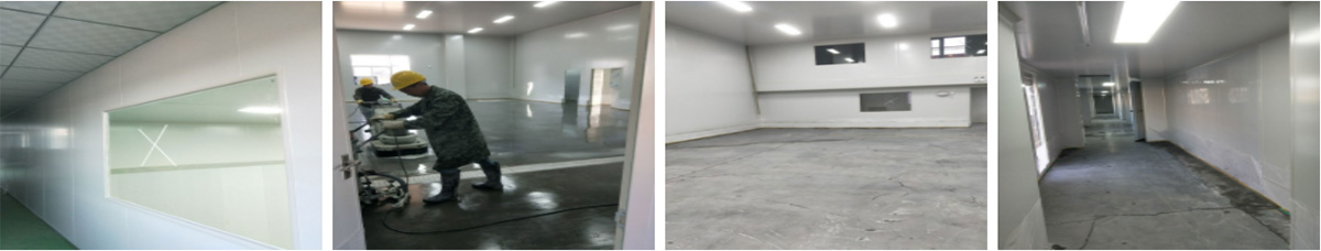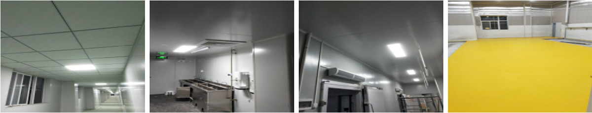 2021-12-4陕西闫府食品有限公司厂房装修现场:1:彩钢墙板完成100% 2:彩钢顶板完成100% 3:撕膜打胶完成98% 4:自制门窗完成95% 5:水电完成100% 6:圆弧完成97% 7:金刚砂完成100% 8:三防板吊顶完成100% 9:地面固化完成100% 10:动力电完成100% 11:空调安装完成100% 12:聚氨酯地面完成100% 13:理化室新增墙板和吊顶完成100% 14:PVC地坪完成100%