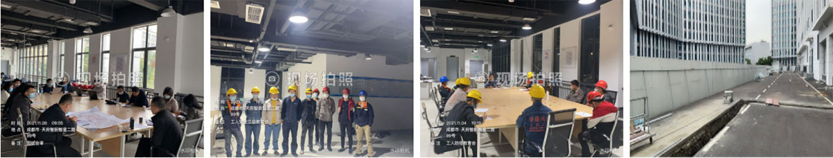 2021-11-8成都天府智慧大厨房科技有限责任公司中央厨房装修现场:工人现场开会安全会议,甲方图审,安全标识标牌张贴