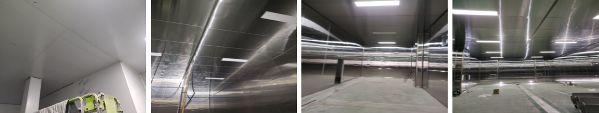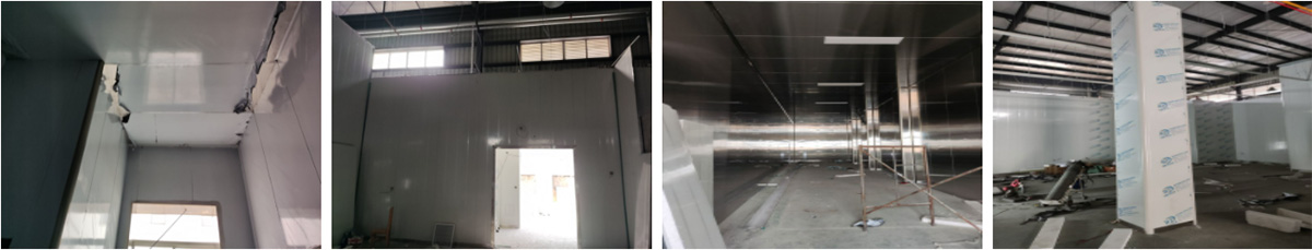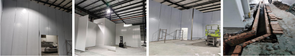 2021-12-21成都寻唐记食品有限公司改造二期车间施工现场:通道、脱包间、配料间墙板和顶板安装完成,内包间包柱子完成。普通灯具安装完成15%,开关插座开孔配管完成。