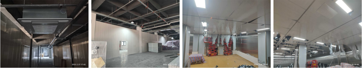 2022-04-03四川丰泰食品科技有限公司厂房装修现场:1,彩钢板隔墙及吊顶完成95% 2,成品门安装完成20% 3,空调模块机组吊装就位,配管完成30% 4,百叶风口安装完成70%