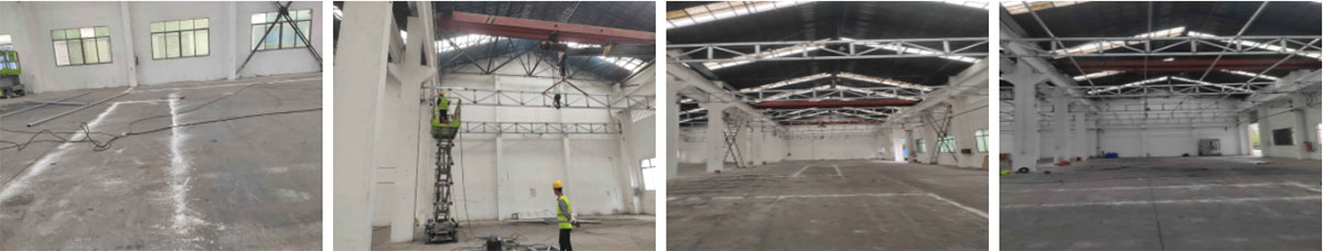2023-2-12四川省曾食记食品有限责任公司二期厂房装修现场:灯具安装,地坪护理
