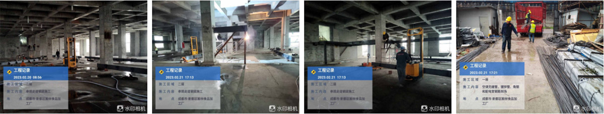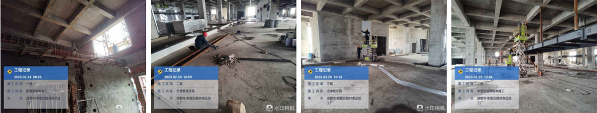2023-02-24 新都区毅琳食品加工坊厂房装修施工现场: 1、二层参观走道钢梁安装100% 2、二层钢平台吊柱安装30% 3、一层配电室植筋及钢筋绑扎完成50% 4、三层墙板地槽安装完成30% 5、二层空调水系统支架制作安装完成40%
