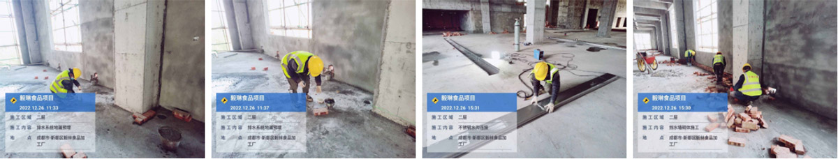 2022-12-26 新都区毅琳食品加工坊厂房装修施工现场:1:二楼不锈钢水沟焊接完成100% 2、二层挡水墙抹灰完成50% 3、二层挡水墙砌体完成90% 4、二层挡水墙砌体卫生整理 5、二层不锈钢排水沟打磨完成