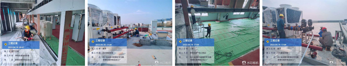 2023-04-19新都区毅琳食品加工坊厂房装修施工现场:今日施工内容:1、屋面空调主机配管完成50% 2、三层剩余聚氨酯地面大沙完成100% 3、三层参观走道角铝安装100% 4、二层火锅料包装区打磨切割完成80% 5、水泵进场验收完成 6、地泵管道加固架管搭设90%