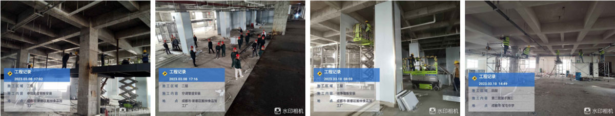 2023-03-13 新都区毅琳食品加工坊厂房装修施工现场:1、四层防水闭水中 2、三层灯具、电源线安装完成40% 3、三层已安装吊顶区域打胶收边完成80% 4、三层冷水给水管安装10% 5、二层彩板顶板30% 6、二层不锈钢排水立管焊接30% 7、二三层参观走道矩管框架焊接100%