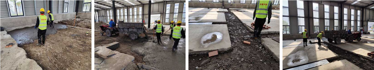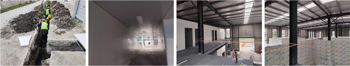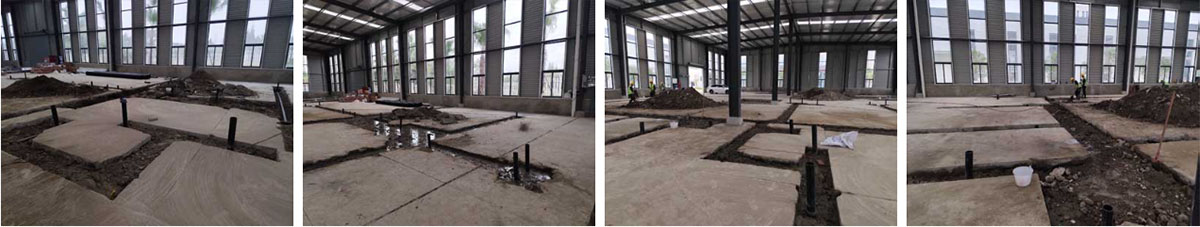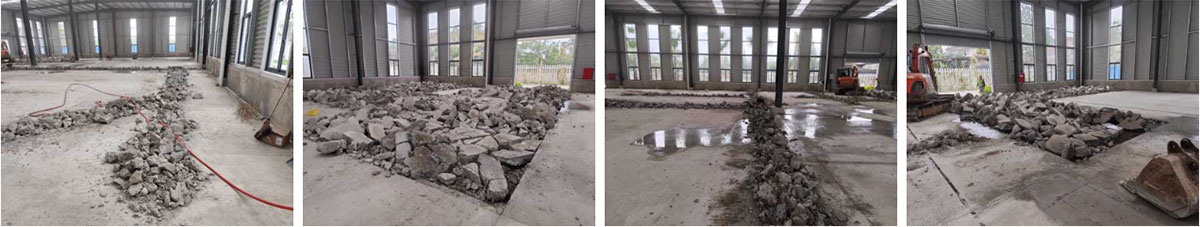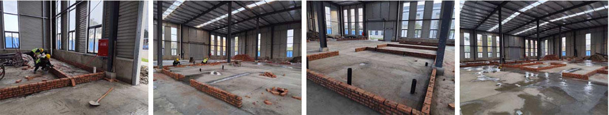 江油小掌门项目厂房装修现场:排水沟施工,二层隔断施工