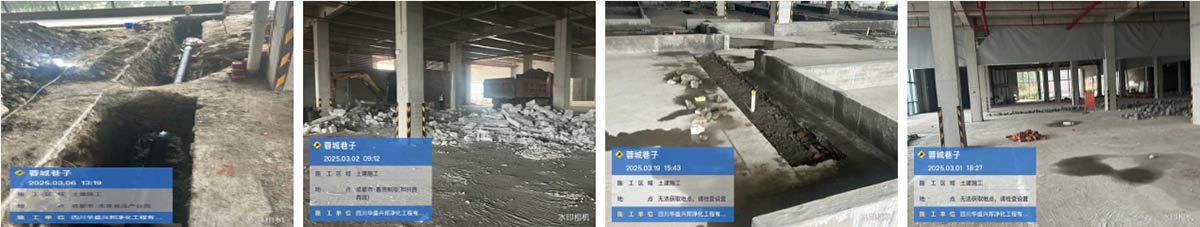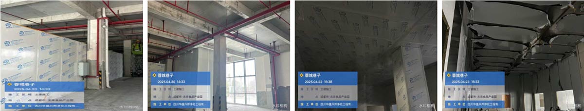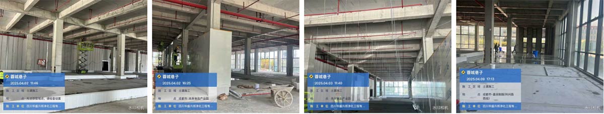 温江蓉城巷子调味品项目厂房装修现场:土建施工、挡水墙施工、净化板材施工