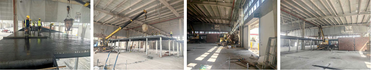 云南东之原野项目厂房施工现场:车间二层钢构搭建,隔断墙体施工