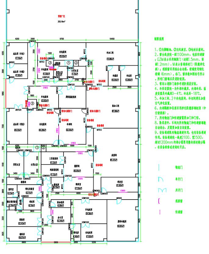 4.门窗设计:车间门为彩钢板制成的、不易变形的单向弹簧门;窗为铝合窗,窗台高于地面1M以上。