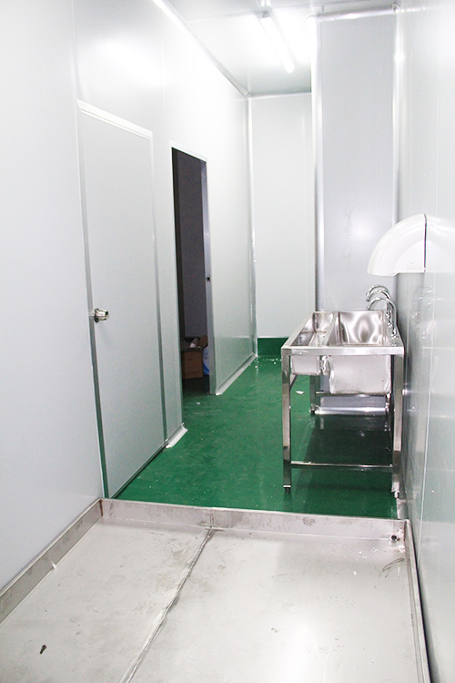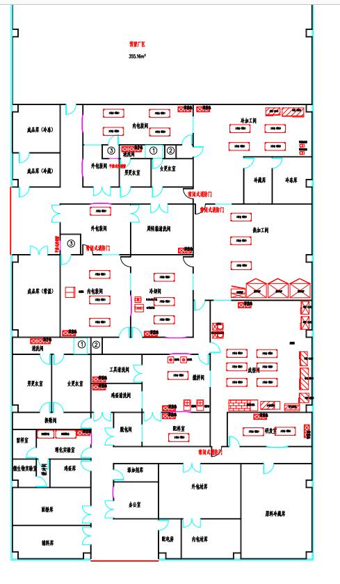 2.墙壁设计:生产车间所有的间隔墙壁可全部采用夹芯彩钢板构建:可采用砖混结构在车间内侧墙壁从地面起1M贴白色瓷片,其余的用白色涂料覆涂,墙壁与地面交界面为漫弯形,没有死角。