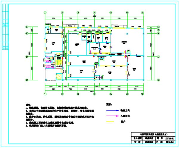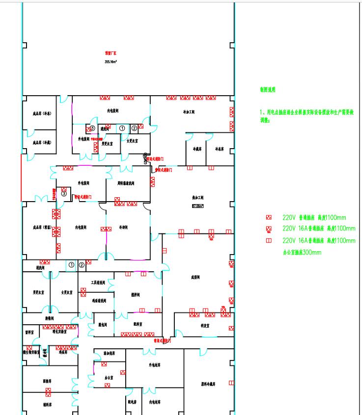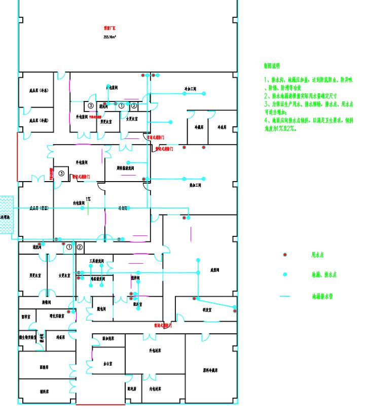 7.给排水设计:生产用水为市政自来水,工厂内部再作进一步处理。更衣室和车间等需清洗排水的功能间并设地漏排水;