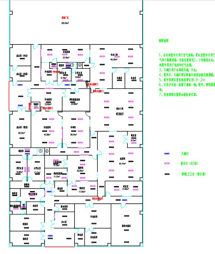 6.采光、照明设计:各生产车间全部以日光灯照明并加装防护灯罩。