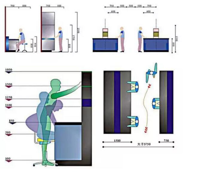 在做平面设计的时候,首先要考虑的因素是就是“安全”,实验室是最易发生爆炸、火灾、毒气泄露等的场所。我们在做平面设计的时候,应尽量地要保持实验室的通风流畅、逃生通道畅通。根据国际人体工程学的标准。我们做如下的划分以供参照:(祥见下图)