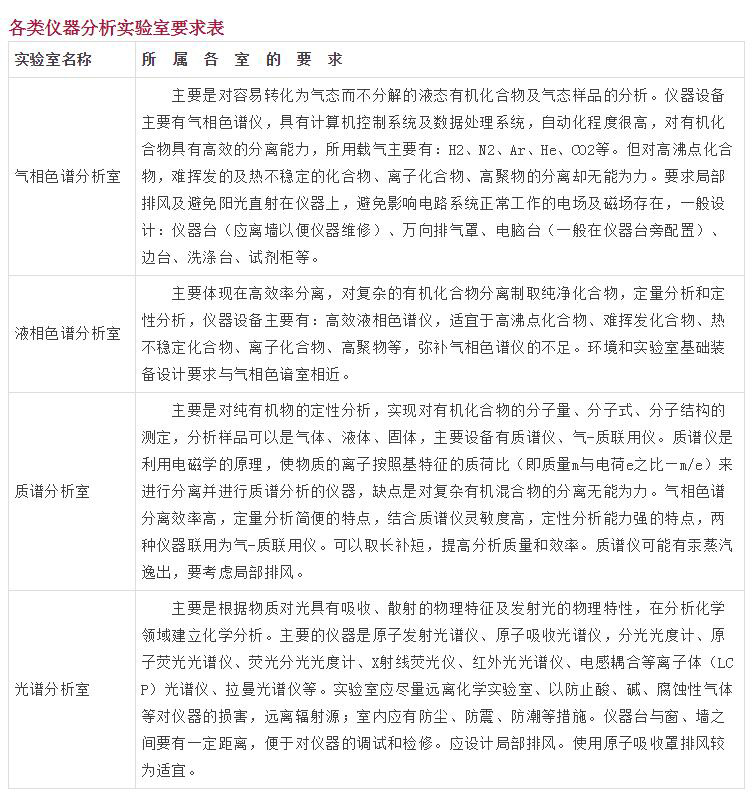仪器分析实验室,主要设置各种大型精密分析仪器,同时也包括普通小型分析仪等,一般设计的装备有:仪器台、实验台、通风柜、天平台、电脑台、气瓶柜、洗涤台、器皿柜、药品柜、急救器、万向排气罩、原子吸收罩等。以下列出各类仪器分析实验室的要求,以供参考。